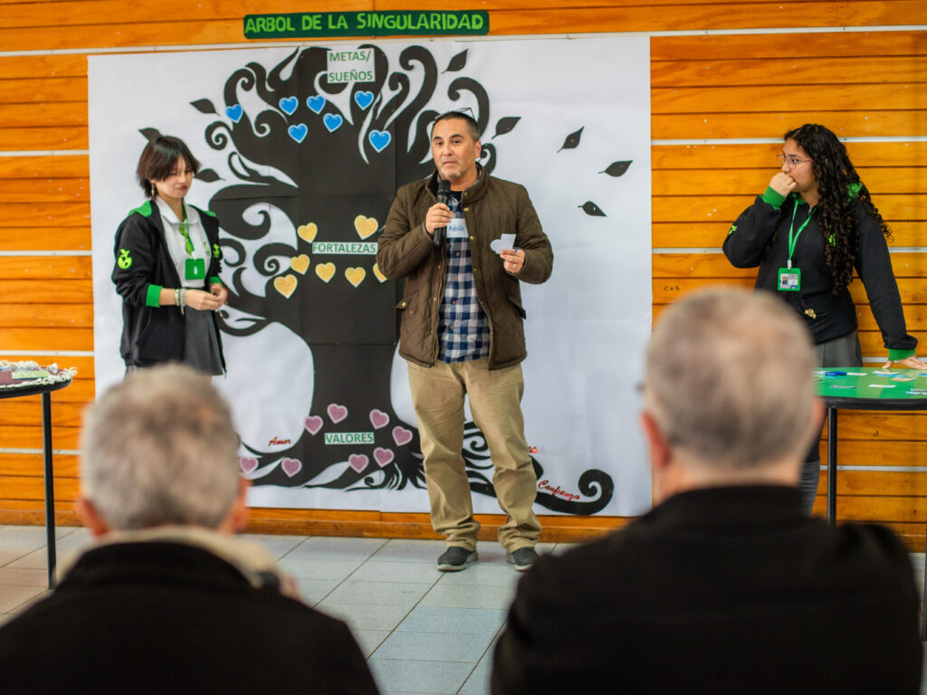 La jornada comenzó en el Liceo Agrícola de Negrete, donde estudiantes, ex estudiantes, apoderados y educadores participaron en una serie de actividades centradas en el reconocimiento de la singularidad y la identidad personal. Acompañados por el equipo de educadores, fueron los propios estudiantes quienes asumieron el rol de anfitriones y guías de la experiencia. Una de las dinámicas más significativas fue “El árbol de mi historia”, que invitó a cada persona a reflexionar sobre sus valores (raíces), fortalezas (tronco) y sueños (ramas y frutos), compartiendo luego en grupo aquello que los define y proyecta. La instancia se complementó con un conversatorio sobre la experiencia de la tutoría, en el que participaron representantes de toda la comunidad educativa, para finalmente recibir la retroalimentación y mirada inspiradora de Coral Regí.